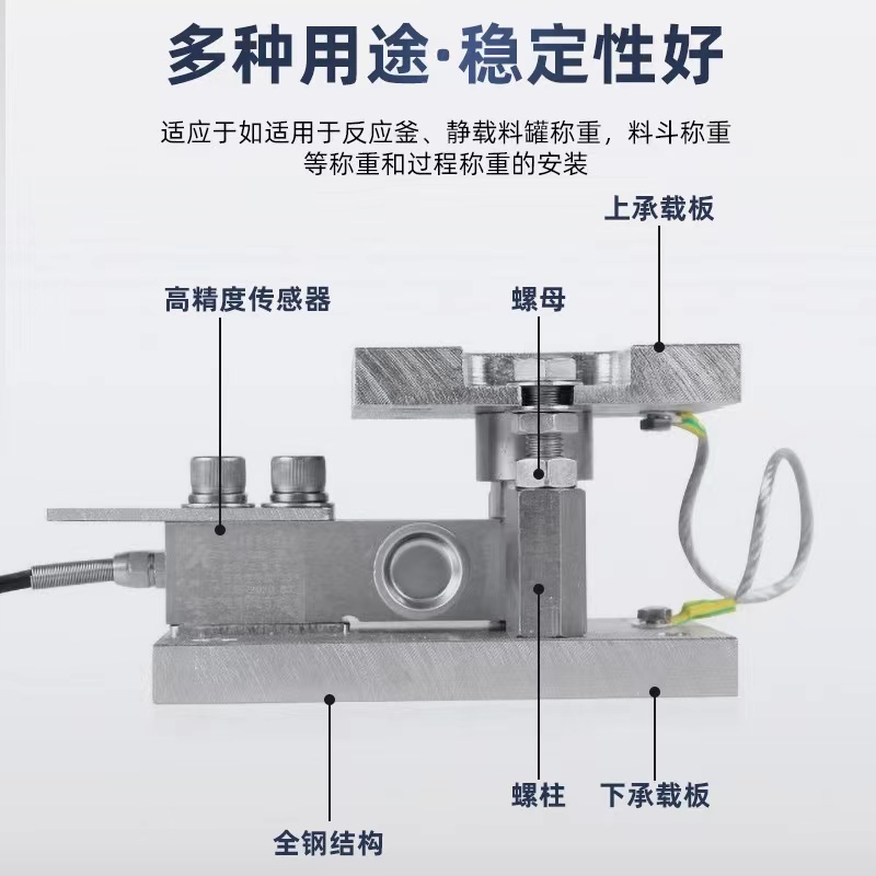 反应釜配料称重模块 配料搅拌罐用计量模块是一种将质量信号转变为可测量的电信号输出的装置。常见地磅传感器多为电阻应变式传感器。用传感器先要考虑传感器所处的实际工作环境,这点对正确选用传感器至关重要。