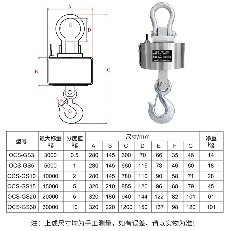 ④:配有无线遥控器,20米范围内可控制吊秤的置零,查询称重记录和关机等功能;